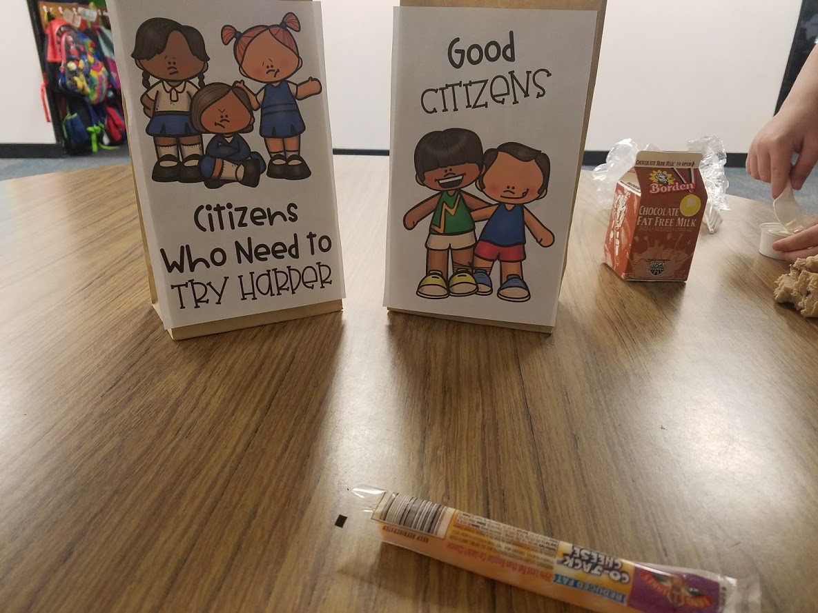 The next two times we met, we played the “good citizen sort” game. It is made the same way with paper bags and laminated cards.